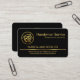An all black cover is accentuated by a faux gold line near the base of the card. ; Riding on this gold line of success is your prestigious business name and the contact details. Near the top is a gold "handyman tools plaque" logo you can use with the job title "Handyman Service" and a slogan caption option which you can change.