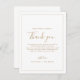 This minimalist gold thank you reception card is perfect for a simple wedding. The modern romantic design features classic gold and white typography paired with a rustic yet elegant calligraphy with vintage hand lettered style. Customizable in any color. Keep the design simple and elegant, as is, or personalize it by adding your own graphics and artwork. Place these cards at the table setting for each of your guests at your wedding reception. Personalize the card with your names and a special thank you message.