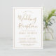 Plain white envelopes are included with paper invitations and will come to fit the invitation size you select. If you don’t need the envelopes, you may choose to not receive them by selecting the dropdown below "Envelopes" and choosing "None." If you’d like to have a design on your envelopes, you can browse all of these available envelopes to find the design that complements your Minimalist Gold Wedding Reception Invitation.
