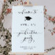 Minimalist graduation party welcome sign featuring script text that says "welcome to XX's graduation party." There is an illustration of a graduation cap.