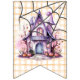 Minimalist halloween cute yellow pink bunting flags - simple and cute, to the point. Minimalist design with yellow grid background a few spiderwebs, a cute mansion and a friendly ghost. If you look closely you will find the spider in the letter O.
