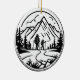 This round ornament showcases a stunning black-and-white design of two hikers walking along a winding trail toward towering, snow-capped mountains. The scene is surrounded by tall evergreen trees, with a few clouds in the sky, evoking a sense of tranquility and connection with nature. The minimalist silhouette style, clean lines, and circular framing highlight the themes of adventure and exploration, making this a perfect keepsake for outdoor enthusiasts.