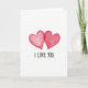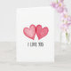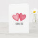 This greeting card shows two watercolor hearts in soft rosy pink and deeper crimson, gently overlapping in the middle. The shared center is darker where the paint layers meet, which makes the connection feel real and close. The hearts look calm and tender, like they’re leaning into each other without rushing. Everything sits on a plain white background, so the colors and the little paint spreads stand out in a quiet way. Below the hearts, the words “I LOVE YOU” appear in simple black hand-drawn lettering, placed near the bottom center of the card. It feels meaningful to give because it says a lot without trying too hard, and it fits romance, affection, or even a caring friendship 🥰. The soft paint texture and slightly uneven lines make it feel human and sincere ❤️. Hope it helps you share your Valentine’s Day feelings with someone you care about.