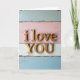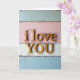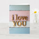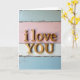 This card shows the words “I love you” in raised, shiny gold letters that sit right in the middle of the front. The letters have a simple, chunky look and cast soft shadows, like there’s a gentle light shining from above. Behind the message are horizontal wooden planks with chipped paint and visible wood grain, giving the background a worn, cozy feel. The top and bottom planks are a light pastel blue, the middle area behind “I love” is a soft pink, and the lower section behind “you” is white. The words are easy to read, and the gold stands out clearly against the pink and white sections. It feels meaningful because the weathered wood and warm gold together suggest love that lasts through time, not just a quick note. Giving it says something simple but true, and it works for romance or a close friendship 🥰❤️. Hope it helps you share your Valentine’s Day feelings in a kind, honest way.