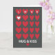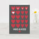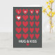 This greeting card shows a charcoal gray background filled with a neat grid of red hearts. In the top row, four white letters spell “LOVE,” set in a simple sans‑serif style and placed right inside the heart grid. Most of the hearts are a deep red, but one heart in the second row is white, standing out like a quiet reminder that one person can feel extra special. The shapes have sharp edges and an even, bright look, so everything feels clear and easy to take in. Near the bottom, “HUG & KISS” appears in white, all caps, in the same straightforward letter style. A small red heart sits just below that line, like a final little sign-off ❤️. It’s a meaningful card to give because it says love plainly while still feeling tender and thoughtful 🥰. Hope it helps you share your Valentine’s Day feelings in a simple, caring way.