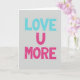 This card features the words “LOVE U MORE” stacked in the center on a soft light gray background. “LOVE” is in turquoise, while “U” and “MORE” are in hot pink, so the message pops right away. The letters are tall and simple, with a sturdy sans‑serif look that feels direct and easy to read. Each letter has a slightly worn, speckled texture, like tiny white flecks across the color, which makes it feel a bit like an old print. There’s also a tiny hint of sparkle on the “O” in “LOVE,” adding a gentle romantic touch ❤️. With nothing else on the front, the card keeps the focus on saying what you mean, whether it’s for a partner or a close friend 🥰. It’s meaningful because it’s short, honest, and a little sweet without trying too hard. Hope it helps you share your Valentine’s Day feelings in a simple, caring way.