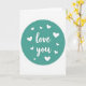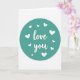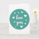 This card shows a teal-green circle centered on a bright white background, giving the design lots of open space. Inside the circle, the words “love you” appear in white, written in smooth, flowing cursive-style lettering. Around the message, small white hearts float in different sizes, scattered lightly across the teal area. The hearts feel like they’re drifting, which adds a gentle, affectionate mood without needing extra details. The simple colors and roomy layout make the message feel direct and sincere, like something you really mean. It’s a meaningful choice for a partner, close friend, or anyone you care about, because it says a lot with just a few elements 🥰. The centered circle and the little hearts help the words stand out, so the focus stays on love and closeness ❤️. Hope it helps you share Valentine’s Day sentiments with someone special.