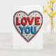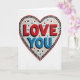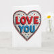 This greeting card shows a large heart made from tiny mosaic tiles on a white background. In the center of the heart, the words “LOVE YOU” stand out clearly, with “LOVE” in deep red tiles and “YOU” in bright blue tiles. Each word has a thin black shadow-like outline that makes the letters look slightly raised from the surface. Around the message, the white tiles include small scattered triangle shapes in red, blue, and black, adding little bursts of detail. The heart is edged with a solid red border, and just inside it there’s a ring of black-and-white dash marks that wrap all the way around. It feels meaningful because the message is direct and the careful tile pattern suggests time, attention, and real care 🥰❤️. It’s an easy way to say what you feel and share Valentine’s Day.