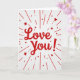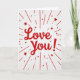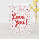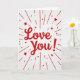 This greeting card features a bright red “Love You!” right in the center, written in smooth, flowing letters that feel like a quick note from the heart. The background is white with faint diagonal stripes that add a little texture without distracting from the message. Red lines burst outward from the middle like little rays, mixing solid lines with short dashed ones for extra movement. Scattered around the rays are small red five-point stars in a few sizes, like tiny sparks around the words. The overall look is simple but full of warmth, and it instantly reads as affectionate and close ❤️. It feels meaningful because it says what you might struggle to say out loud, in a clear and direct way. Give it to a partner or a close friend when you want them to feel noticed and cared for 🥰, and enjoy sharing Valentine’s Day sentiments.