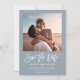 Minimalist Modern Save the Date announcement with trendy white brush script hand lettered typography on dusty blue with your personal photo alongside your names and date of the wedding.
