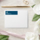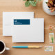 Bold white monogram initials with left aligned return address on a navy blue color block frame.