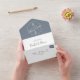 Simple, minimalist, modern, contemporary dusty blue all-in-one wedding invitation with QR code, unique monogram with hand drawn love couple birds, trendy handwritten script and custom picture of the at the back.