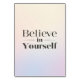 A high-quality, printable motivational poster featuring the powerful quote "Believe in Yourself." The design adopts a minimalist style, showcasing elegant, classic serif typography against a soft, ethereal pastel gradient background (with shades of pale pink, yellow, and blue). Ideal for adding a touch of sophisticated inspiration to any modern office, study, or home decor. This high-resolution image is perfect for printing and framing.