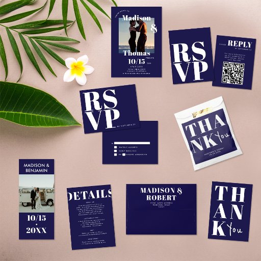 There is absolutely no limit to the number of times a digital design can be downloaded. You can print these designs with Zazzle, at home, at a print shop, or all of the above. You can also apply the themes of your Minimalist Navy Blue And White Simple Bold Wedding Invitation to complementary Zazzle products such as party supplies. Even after you download your designs, you can continue to use your website and editing design software to continue to improve or modify the designs.