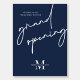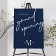 Welcome your launch company party guests with this modern Navy Grand Opening Welcome Sign. This minimalist blue background business launch event sign is perfect to use for the opening of your new boutique, beauty spa or shop. The trendy script font writes 'Grand Opening' with space for your logo and event date so you can make a personalized sign for your small business celebration.