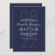 features bride and groom's name in white modern script font style and details in white sans serif font style with large date in light navy blue as background on navy blue background.