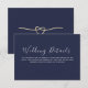 Minimalist, modern, elegant navy blue wedding details card with gold rope heart at the back and simple calligraphy script.