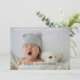 Simple, minimalist Baby Announcement One Photo Card with name and details overlay in white and dark grey text. Back side is a grey blue shade with white text.