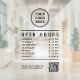 Present your business hours clearly and professionally with this modern Open Hours clear window cling. Designed with a clean layout, your logo and QR code, and easy-to-read lettering, this sign helps customers instantly see when you’re open -- while reinforcing your brand at the storefront. Ideal for retail stores, salons, cafés, restaurants, studios, clinics, and service-based businesses. With one quick scan, customers can visit your website for updates, services, menus, appointments, or additional business information. Easy to apply and remove, this professional window decal is perfect for glass doors and windows. It reduces confusion about hours, improves the customer experience, and creates a polished, trustworthy first impression before customers walk inside. Upgrade your storefront with a simple, stylish window sign that keeps customers informed and connected.