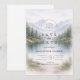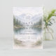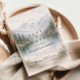 A serene and atmospheric design inspired by misty mountain landscapes and quiet forest scenery. Soft watercolor layers of pine trees and distant hills fade gently into the background, creating depth and a calm, romantic mood. The muted palette of sage green, cool grey, and soft ivory gives the design a refined, nature-driven elegance—perfect for couples drawn to minimalist aesthetics and intimate outdoor celebrations.