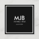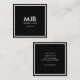 A square double sided black and white business card. The front shows a black background with a white border, a monogram, your name and title, the back shows contact and information.