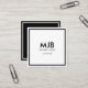 A square double sided black and white business card. The front shows a white background with a black border, a monogram, your name and title, the back si in inverted colors shows contact and information on black background