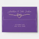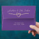 Simple, elegant, minimalist purple 5x7 envelope for wedding invitations with return address, modern calligraphy script and gold rope heart.