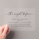 Elevated in its simplicity, this transparent acrylic rehearsal dinner invitation features sleek black typography for a bold yet refined impression. Featuring the phrase “The Night Before” in black script, this simple and modern design is perfect for elegant weddings, black-tie events, or couples who love a clean and stylish look. Printed on clear acrylic, the transparent background allows your invitation to stand out with contemporary edge - a stunning choice for urban venues, loft spaces, gallery weddings, or stylish rooftop dinners. The contrast of black on clear adds both modernity and timeless elegance, making it a versatile option for any season.
