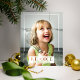 Simple and clean minimalist template with thin line border and cut-out Rejoice text on white banner. Place for your photo and line of editable text. Choose background color on back of card to match your photo.