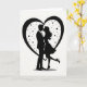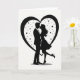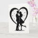 This greeting card shows a black silhouette of a couple holding each other close and leaning in for a kiss on a bright white background. The man wears a suit, and the woman has a flowing dress with one leg gently lifted behind her, high heel pointed as if she’s caught up in the moment. Their faces are turned toward each other, and their pose feels tender and fully focused on being together. A large heart outline in black frames them, making the scene feel like it’s happening inside a shared little world. Small stars and tiny dots are scattered around them inside the heart, like a quiet night sky that adds a touch of wonder. There isn’t any text on the front, so the picture does all the talking and leaves room for your own words inside. It feels meaningful to give because it captures that simple, close feeling of love and support without needing anything extra 🥰❤️.