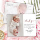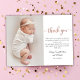 Simple Modern Elegant Rose Gold Script Photo Newborn Baby Thank You Postcard. Featuring a beautiful "thank you" text in a cursive handwritten calligraphy swash tail font script in faux rose gold foil (or blush pink foil) and pre-made personal message Great for baby girl. Easy to personalize with your baby photo and details.