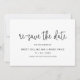 Modern black and white typography Wedding Postponement Announcement Card featuring a simple design with "re-save the date" in an elegant thin handwriting script font. Below are four lines of text for your details. The backside has your personal message in white over a black background. A chic and stylish design to announce that your wedding has been postponed.
