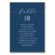 Customizable table number seating plan. It features a navy blue and white whimsical script and classic typography. Personalize by adding your own details. This minimalist table seating plan is perfect for weddings, baby showers, bridal showers, birthdays, and so much more.