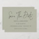 Minimalist Script Pale Sage Green Save The Date. Simple elegance with Save The Date in a modern set script.The rest of the text you can easily personalise.Shown here in black on soft light Sage green however the text and background colors can be changed if you wish via the customise further option.