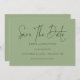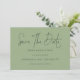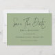 Minimalist Script Sage Green Save The Date. Available digitally and printed. Simple elegance with Save The Date in a modern set script.The rest of the text you can easily personalise.Shown here in black on Sage green however the text and background colors can be changed if you wish via the customise further option.