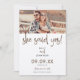Minimalist She Said Yes Photo Script. A fun photo design to invite your guests to save your wedding date with a modern informal set script for She Said Yes! The word "and" in between your names and Please Save Our Date towards the bottom are both in the same set script. The rest of the text can be easily personalised. Easily upload your favorite photo of you both to replace the sample in the template holder.