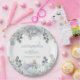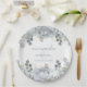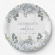 A beautiful Floral paper plate with wedding elegant floral light blue, botanical greenery green foliage, simple minimalist custom party engaged, engagement couple rose garden flower, reception party bridal shower décor, bride and groom name ampersand, modern calligraphy script font, whimsical typography text font, a romantic fall winter spring summer, a simplistic elegance wedding paper plate