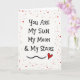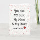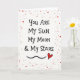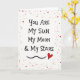 This greeting card centers on the message “You Are My Sun My Moon & My Stars” in black, flowing handwritten-style letters on a white background. The words are stacked neatly in the middle, making the message feel direct and easy to read. Under the text, a thin black curl sweeps down and ends in a single red heart, like a small signature of love ❤️. Around the message, small dots in red and soft pink are scattered across the white space, giving the front a gentle, confetti-like look. The simple color mix of white, black, and red keeps the focus on what you’re trying to say without distraction. It feels meaningful because it compares someone to the things that guide you and light up your life, which is a sweet way to show how much they matter 🥰. It’s a thoughtful choice for a partner or close friend when you want your feelings to come through clearly. Hope it helps you share your Valentine’s Day sentiments.