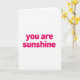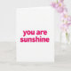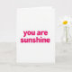 This greeting card features the words “you are sunshine” centered on a plain white background. The text is in a simple sans‑serif letter style, with thick strokes that make it easy to read. It’s printed in a strong fuchsia pink that stands out clearly against the white. There are no pictures or extra objects, so your eyes go straight to the message. The letters feel friendly, and the dot over the “i” in “sunshine” adds a small, sweet detail. It’s a meaningful card to give because it tells someone, in a direct way, that they brighten your day 🥰. It works for a partner, a close friend, or anyone you care about, especially on Valentine’s Day ❤️. Hope it helps you share Valentine’s Day sentiments with someone special.
