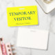 This basic badge design features the message "TEMPORARY VISITOR", and a customizable company name or other custom message. A badge like this could be used to identify that somebody at a workplace or business is an authorized guest/visitor. [~Z0000307]