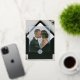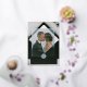 This modern wedding invitation card features a clean, minimalist design printed on transparent acrylic, showcasing a full-color photograph of the couple as the backdrop. The wedding details are elegantly written in a white serif font, centered for a sophisticated look. The card is complemented by a black envelope, sealed with a silver wax monogram for an upscale touch. Perfect for couples looking to blend personal elements with formal and contemporary style, this invitation exudes a sense of modern luxury and refinement.