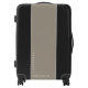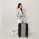 Personalized luggage with your names in a retro minimalist typewriter font in white in the corner on a taupe brown background.