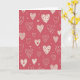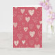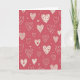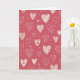 This greeting card shows a repeating pattern of off-white hearts scattered across a warm rose-red background. Each heart is a little different, with some filled with thin horizontal stripes and others dotted with tiny circles or small red hearts. A few hearts include crossed arrows inside, which adds a sweet hint of romance. Between the hearts, you can spot small dots and little checkmark shapes that keep the pattern feeling lively without being busy. There isn’t any text on the front, so the hearts do all the talking and leave room for your own words inside. It feels meaningful to give because it looks like many small ways of saying “I care,” whether that’s for a partner or a close friend 🥰. The overall look is warm and steady, like a simple reminder that love can show up in everyday details ❤️.