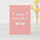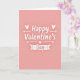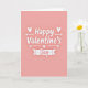 This greeting card features a soft pink background with the message “Happy Valentine’s Day” in rounded white letters that look slightly raised. The words sit right in the center, making the greeting easy to notice and feel close and direct. “Happy Valentine’s” appears in solid white, while “Day” is set inside a white banner with a thin darker-pink outline around the letters. Small white arrows on each side point inward like a gentle Cupid touch, and tiny heart shapes stand in for little marks around the wording. Light shading under the white elements gives the design a subtle layered look, like the letters are resting on the card instead of printed flat. It feels sweet and calm, which makes it a thoughtful choice for a partner, a close friend, or anyone you want to remind that they matter 🥰. The simple layout keeps the focus on love and kindness, so your note inside can do the talking ❤️. Hope it helps you share your Valentine’s Day feelings in a warm, easy way.