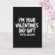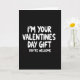 This greeting card keeps things simple with a deep black background and a big white message that does all the talking 🥰. The main text reads “I’M YOUR VALENTINES DAY GIFT” and it sits across the upper two-thirds of the front. The letters are white, rounded, and look a bit like casual marker writing, making the joke feel friendly instead of too serious. Under that, near the lower part of the card, it says “YOU’RE WELCOME” in smaller white letters in the same style. There aren’t any pictures or extra objects, so your eyes go straight to the words and the humor lands right away. It’s a fun choice for a partner or close friend when you want to flirt, tease a little, and still show real affection ❤️. The simple look makes it easy to give, because it says “I like you” with confidence and a grin. Hope it helps you share a little Valentine’s Day love and kindness with someone special.