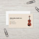A minimalist business card for a violin teacher or violinist performer, with an illustration of a brown acoustic violin on a beige background. It comes with contact information illustrated by icons.