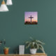 Minimalist white cross adorned with lavender sprigs and a gradient sunrise backdrop.