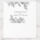A minimalist white wedding invitation featuring a hand-drawn line art rendition of a rose, buds and leaves.
