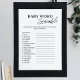 minimalist, scramble word card for baby shower The words on this card are all related to babies and have been scrambled. The guests will compete to see who can unscramble them all first! ANSWER KEY: 1. car seat; 2. milk 3. playpen 4. pacifier The fifth item is a diaper rocking chair. 7. nursery 8. baby monitor; 9. swaddle 10. formula. 11. rubber ducky 12. stroller. 13. monitor. 14. teether. 15. Thermometer.