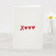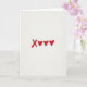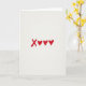 This greeting card shows four red marks in a row at the center: an “X” followed by three hearts. The shapes look like they were painted with a wide brush, so you can see the streaks and a little texture in the red. Each heart is slightly uneven, which makes it feel human and real rather than perfect. The background is plain white, so the red X and hearts stand out right away. There isn’t any extra scene or objects, just that simple “hugs and kisses” message shown in pictures. There’s no written note on the front, so the X and hearts act as the message, placed right in the middle where your eyes naturally land. It feels meaningful because it’s direct and honest, like you’re saying “I care about you” without needing a lot of words 🥰